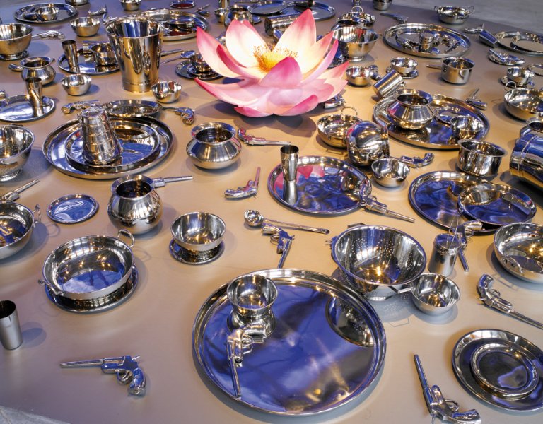 Assemblage d’ustensiles de cuisine en acier inoxydable à l’intérieur d’un cercle de film adhésif argenté entourant une fleur de lotus, la sculpture The Way Home I, réalisée entre 1998 et 1999 par l’artiste indien Subodh Gupta, nous parle avec tendresse des liens étroits qui relient, dans la culture indienne, l’univers de la cuisine à la vie spirituelle quotidienne.